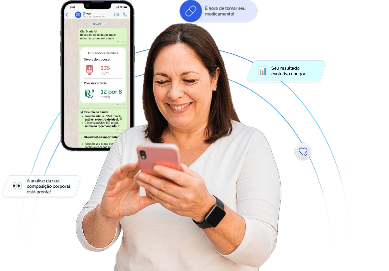 A CINCO disponibiliza um ecossistema de saúde conectado, combinando dispositivos médicos homologados, inteligência artificial via WhatsApp e suporte remoto para transformar dados em cuidado prático.